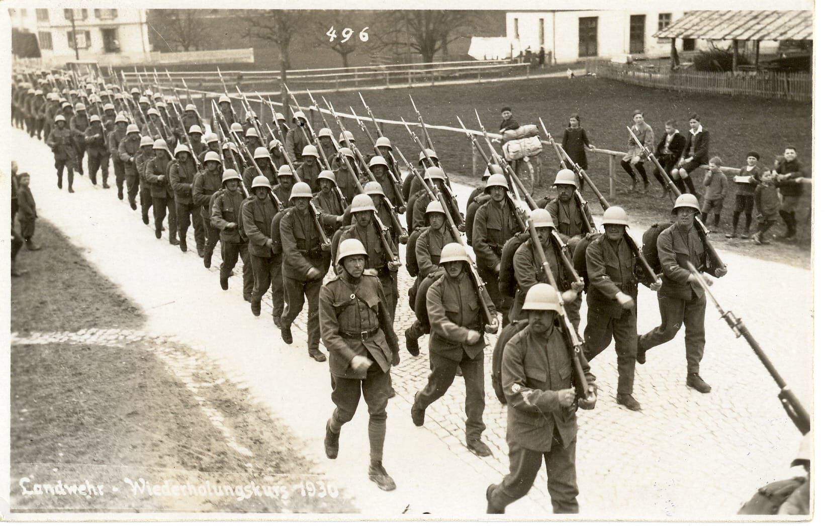 . C’est le « mythe du coup de poignard dans le dos ». En janvier 1934, un auteur français évoque le réarmement décidé par Hitler ; il déclenchera une guerre par surprise, menée à un rythme très rapide Général J. Rouquerol : « L’instruction sur le tir de l’artillerie », janvier 1934.. Les tensions s’aggravant, la RMS explique les efforts de défense des petits Etats européens : Belgique, Pays-Bas, Finlande et Tchécoslovaquie« Informations », juin 1936.. Plusieurs articles, parlent « d’un conflit qui pourrait éclater autour de la Suisse, des Etats voisins qui pourraient nous envahir. » Selon le colonel Henri Lecomte, un adversaire n’attaquera pas la Suisse d’entrée de jeu, mais le risque d’invasion deviendra beaucoup plus grand si les fronts se stabilisaient à nos frontières« Armée offensive ou défensive », août 1938..