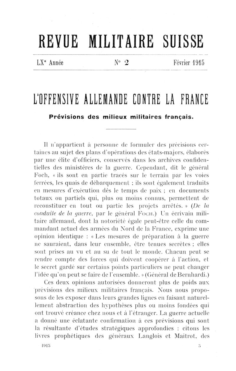 En 1915, un supplément de la RMS, un volume de 336 pages, Avant-propos stratégiques de la plume du colonel Feyler, commente les batailles de la Marne, de l’Aisne, des Flandres, de Neuve-Chapelle et d’Ypres. Il donne dans le détail les événements – illustrés par des croquis – et la version des deux camps. Des cartes des secteurs de combat sont annexées. C’est ouvrage est le « développement corrigé » d’études parues au jour le jour dans le Journal de Genève. Selon l’auteur, c‘est « une oeuvre de transition en ce qu’elle tient le milieu entre l’information quotidienne, rapide et fugace, et l’histoire réfléchie. Un point de départ, en ce que, sur la base de l’information quotidienne, elle échafaude les suppositions qui précèdent la certitude. »Préface du supplément, La guerre européenne : avant-propos stratégiques.